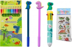 Il set include inoltre due penne decorate con motivi di dinosauri, destinate a diventare le preferite di ogni piccolo fan di queste affascinanti creature. Nell’astuccio sono presenti anche un temperino, un cappuccio per penna a forma di dinosauro e adesivi colorati con motivi di dinosauri, con cui decorare quaderni, libri o lo stesso astuccio, rendendolo ancora più unico.