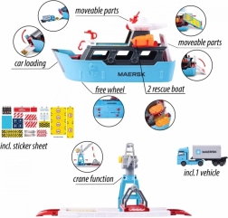Questa coinvolgente stazione portuale porta ai bambini il mondo autentico della logistica marittima. La gru manuale carica container e auto sulla nave, la rampa pieghevole facilita la movimentazione e il camion MAN TGX con licenza garantisce il trasporto fluido delle merci. Il tutto è completato dall’iconico design MAERSK, che sottolinea una vera esperienza portuale.