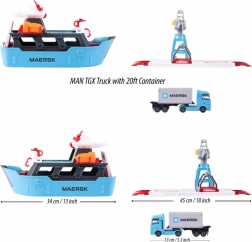 Scopri il porto ufficialmente licenziato MAERSK di Majorette – un set logistico dettagliato con nave cargo, gru a comando manuale e camion MAN TGX con container. Grazie alle funzioni realistiche, agli elementi mobili e alla possibilità di giocare nella vasca e sul pavimento, i bambini si divertiranno per ore con un gioco creativo.