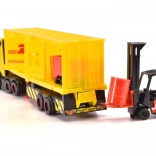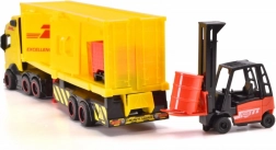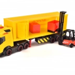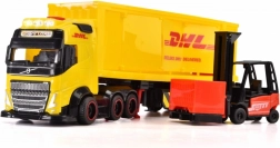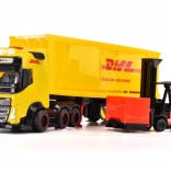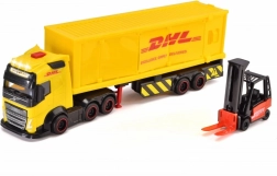 Camion Volvo con licenza del corriere DHL. Funzioni luminose e sonore, parti apribili e mobili. Inclusi carrello elevatore e casse di carico. Lunghezza 35 cm.
