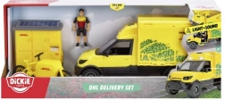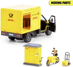 Scopri il realistico set da corriere con licenza DHL e veicolo VOLVO di Dickie Toys. Il set offre effetti luminosi e sonori, porte apribili, una mini-figura del corriere, paczkomat/box per pacchi, bicicletta e accessori per un gioco fantasioso. Ideale per sviluppare creatività, motricità fine e pensiero logico dei bambini.