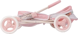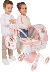 Il passeggino è pieghevole, quindi si ripone facilmente o si porta in viaggio. Il pratico ripiano inferiore, il morbidissimo materassino e la copertura della navicella con asole assicurano comfort per la bambola e ordine durante il gioco. Nella confezione è incluso anche un zainetto alla moda, che si può fissare al maniglione o portare sulle spalle.