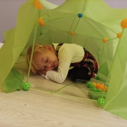 Costruisci la tua base segreta, una cupola, un tunnel o una tenda – la fantasia non ha limiti. Le robuste bacchette in plastica e i solidi connettori sferici permettono di creare strutture stabili che si possono coprire con il telo verde in dotazione. Grazie alle cannucce fluorescenti le creazioni risaltano anche con luce soffusa.