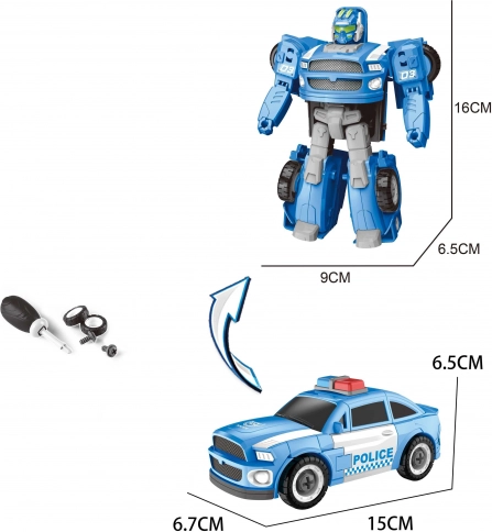Costruisci il tuo autorobot della polizia grazie al cacciavite incluso. Questo modello ha dimensioni di 15x6,7x6,5 cm e include una semplice istruzione illustrata per il montaggio, posizionata sul lato inferiore della confezione.