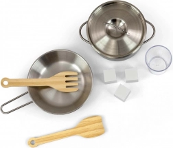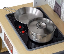 Contenuto della confezione: padella in metallo, pentola con coperchio, spatola e forchetta in legno, bicchiere trasparente e 3 cubetti di ghiaccio. La cucina cresce con il bambino grazie ai prolungamenti regolabili delle gambe, garantendo anni di gioco gioioso.