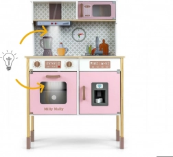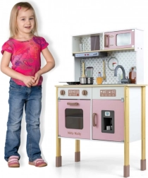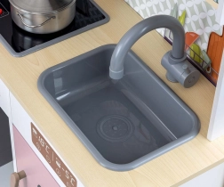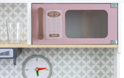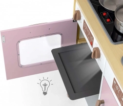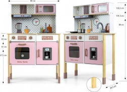 Include forno con finestra trasparente, forno a microonde, frigorifero con fabbricatore di ghiaccio realistico e lavello a una vasca. Sul pannello sono presenti cappa con luce e suono, ganci scorrevoli per appendere gli accessori e orologio analogico con lancette mobili per imparare l’ora. Le illustrazioni degli elementi della cucina sulla parete stimolano fantasia e gioco a tema.