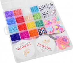 - Organizer trasparente con scomparti, 2× filo da infilare, perline con lettere, perline a pois, perline a forma di cuori, fiori e fiocchi, perline piccole (16 colori), pinzetta, forbici