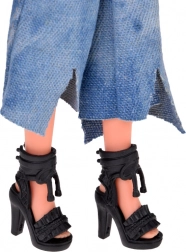 Il top rosa con motivo, i jeans classici e le scarpe nere con tacco donano alla bambola un look moderno per ogni occasione.