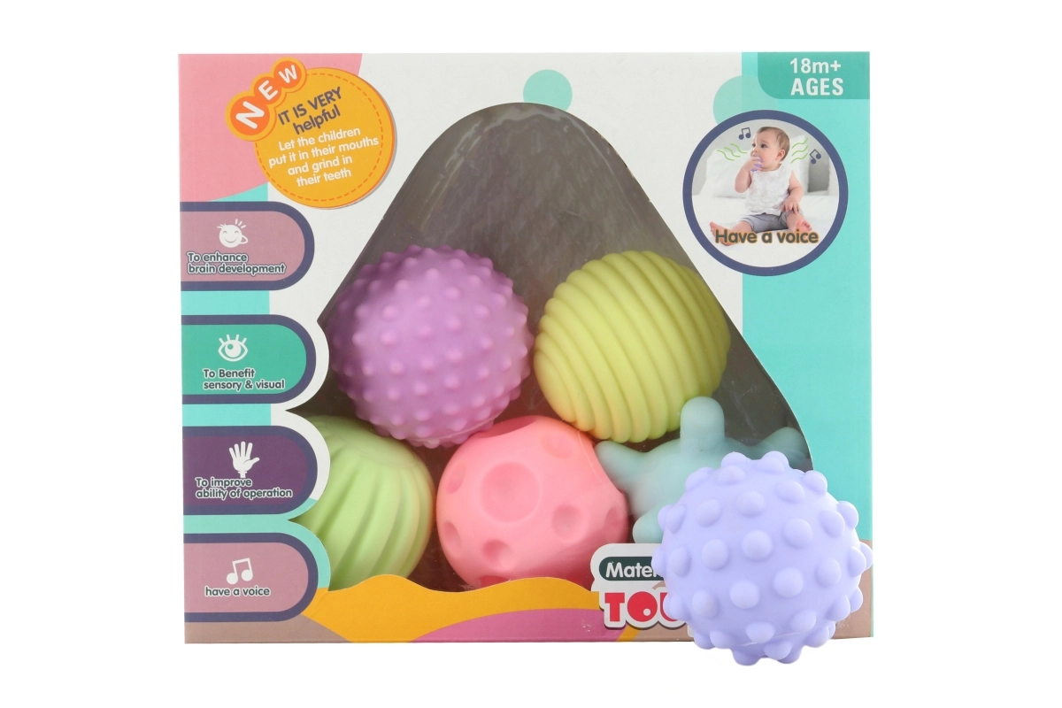 Set di palline sensoriali per i bambini più piccoli. Le palline sono di forme e colori diversi. Le palline sono sonore (emettono un fischio). Confezionate in scatola. Dimensioni della confezione circa 21x18x7 cm. Dimensione delle palline circa 5-6 cm. Età 18 mesi e più.