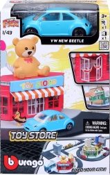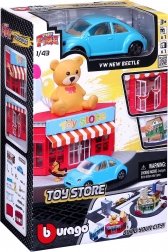 Costruisci la tua città con il set di gioco Bburago City Negozio di giocattoli 1:43. Modello d'auto in metallo in scala 1:43, edificio in plastica con porte mobili, elementi stradali e pedonali e vari accessori per un gioco creativo. Il set può essere combinato con altri set della serie StreetFire.