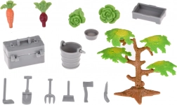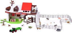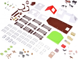 Il set comprende figurine di animali in plastica come cani, cavalli, maialini, pecore e mucche, realizzate con particolare attenzione ai dettagli. Non mancano nemmeno le figure del contadino e della massaia che arricchiscono il gioco con le attività quotidiane della fattoria. Il set include anche un trattore con rimorchio, attrezzi da giardino e adesivi decorativi per una personalizzazione della fattoria.