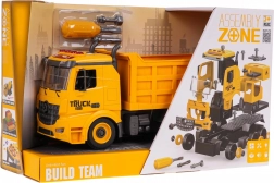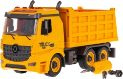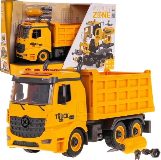 Giocattolo divertente ed educativo per piccoli costruttori: autocarro ribaltabile smontabile per bambini dai 3 anni con effetti luminosi e sonori. Inclusi cacciavite con punte intercambiabili, grazie al quale il bambino allena la motricità fine e comprende i principi del montaggio. Il ribaltabile ha trazione anteriore, cassone sollevabile con sponda posteriore apribile e sul tetto luci lampeggianti e pulsanti funzionali per i suoni di avviamento, retromarcia, clacson e allarme. Le batterie 3× AG13 sono incluse nella confezione.