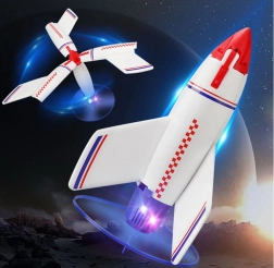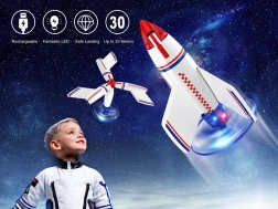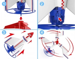 Questo razzo leggero e resistente combina un telaio in plastica con una morbida schiuma per un uso più sicuro. In discesa le ali si aprono automaticamente e funzionano come un paracadute, garantendo un atterraggio stabile e morbido. Il decollo è semplice: basta posizionare il razzo sulla piattaforma di lancio e avviarlo con un pulsante o con il telecomando.