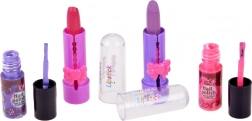 Lucidalabbra, rossetti, smalti, palette di ombretti con applicatore e tip adesivi – tutto coordinato in giocose tonalità di rosa‑viola.