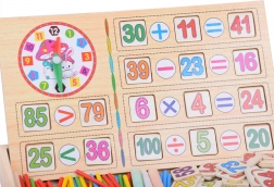 La lavagnetta bifacciale offre due superfici: una per gesso per scrivere, disegnare e risolvere esercizi, e una illustrata per associare le cifre corrette alle immagini. I bastoncini da conteggio aiutano a comprendere l’aritmetica di base in modo concreto e giocoso.