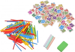 - Set completo: lavagnetta, cifre 0–9, simboli matematici (+, −, ×, ÷, =), bastoncini da conteggio, gessetti colorati, spugnetta.