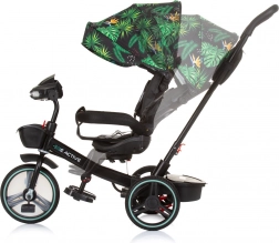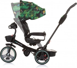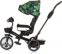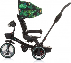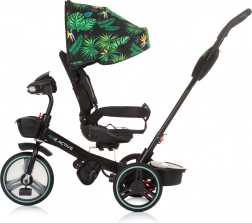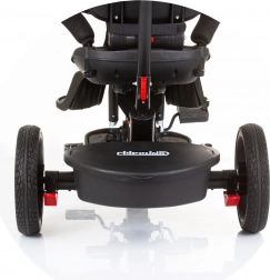 Per la massima versatilità, il triciclo dispone di poggiapiedi pieghevole e mobile sul telaio e di poggiapiedi superiori removibili utilizzabili in entrambe le direzioni. I componenti removibili (cappottina, barra, maniglione) facilitano il passaggio tra le modalità. È inclusa anche una borsa per accessori sulla barra di guida.