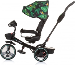 Comfort e sicurezza sono garantiti da cinture di sicurezza con morbide imbottiture, barra di protezione removibile, copertura della ruota anteriore contro l’intrappolamento dei piedini e freni a pedale sulle ruote posteriori. Le ruote in gomma di alta qualità assorbono le irregolarità, mentre la cappottina pieghevole con visiera parasole offre ombra. Non mancano musica e luce nel manubrio (2× AA), regolazione della posizione del sedile, morbida imbottitura e pratici cestini portaoggetti anteriori e posteriori.