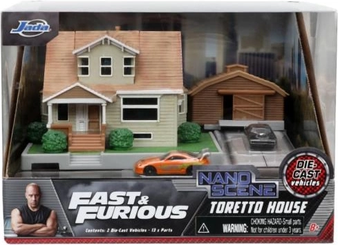 Inclusi due veicoli leggendari – Dodge Charger e Toyota Supra – in versione metallica con ruote libere, ruote sterzanti e pneumatici in gomma per un look realistico. La diorama è completata da barbecue da giardino e arredi che ricreano la scena famosa dei film.