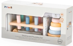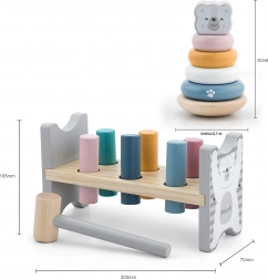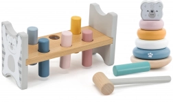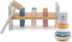 Il set include due giochi per bambini dai 12 mesi in su - una piramide e un batti-batti, entrambi con il motivo di un tenero orsetto. I bambini possono impilare gli anelli colorati della piramide in ordine logico, mentre il gioco con il batti-batti prevede di battere i pioli colorati con il martelletto incluso. Quando necessario, il batti-batti può essere girato per proseguire il gioco.