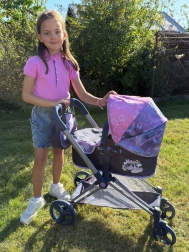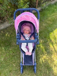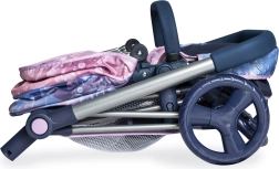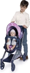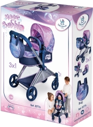 Il passeggino offre dettagli studiati per un gioco confortevole: sistema di cintura a tre punti per allacciare in sicurezza la bambola, capottina regolabile contro il sole, copertura della navicella con chiusura a strappo per un fissaggio rapido e un ampio cestello inferiore per gli accessori. Incluso anche una elegante borsa rotonda nei colori della collezione, abbinata al vivace motivo a bolle.