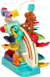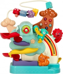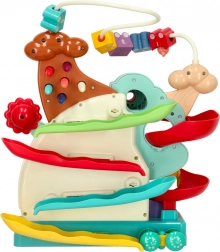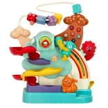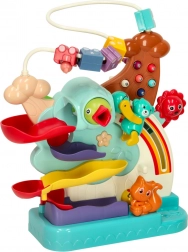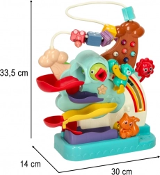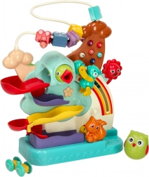I colori vivaci e il movimento fluido delle biglie potenziano la percezione visiva, mentre la manipolazione degli elementi affina la motricità fine. Il bambino allo stesso tempo si familiarizza con i numeri e impara le relazioni di causa ed effetto.