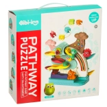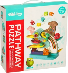 Biglie colorate e una piccola automobilina sfrecciano su due livelli di pista, favorendo concentrazione e coordinazione. I bambini si divertono a osservare la caduta delle biglie e a provare nuove combinazioni.