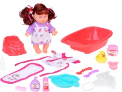 bambola con modulo sonoro, vaschetta, vasino, paperella, “cosmetici” da bagno, spugnetta, biberon, ciuccio, asciugamano, accappatoio, piattino e posatine
