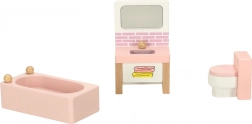 Vasca, lavandino, WC e set cucina con lavello, fornello, frigorifero, tavolo e sedie. I bambini esercitano le routine quotidiane giocando.