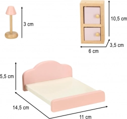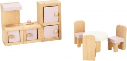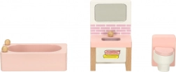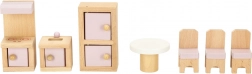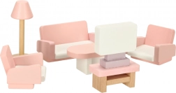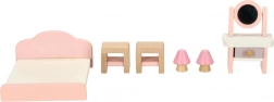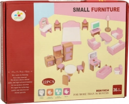 Set di mobili in legno elegante per la casa delle bambole che arreda soggiorno, camera da letto, bagno e cucina. Legno naturale di qualità, vernici sicure in rosa e bianco, per un totale di 22 pezzi. Sostiene creatività, percezione spaziale e apprendimento attraverso il gioco dai 3 anni.