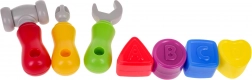 Sotto il piano c'è un cassetto apribile dove i bambini possono riporre attrezzi e blocchi a forma di varie lettere e forme. L'officina è alimentata da tre batterie tipo AG13 incluse nella confezione.