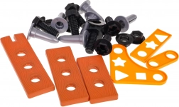 Cacciavite, martelletto, chiavi, pinze, occhiali e mascherina protettivi, listelli in legno e materiale di fissaggio. Tutto per costruzioni creative e l’allenamento della motricità fine.