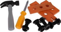Martello, cacciavite, viti, tavolette con fori e altri accessori offrono spazio alla costruzione libera, all’allenamento della motricità fine e allo sviluppo dell’immaginazione.