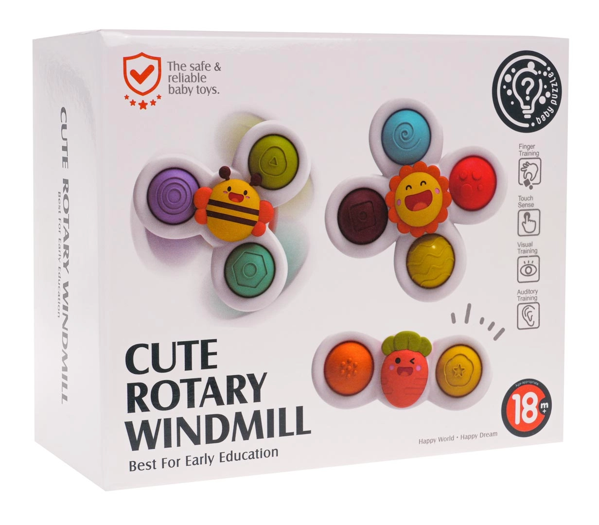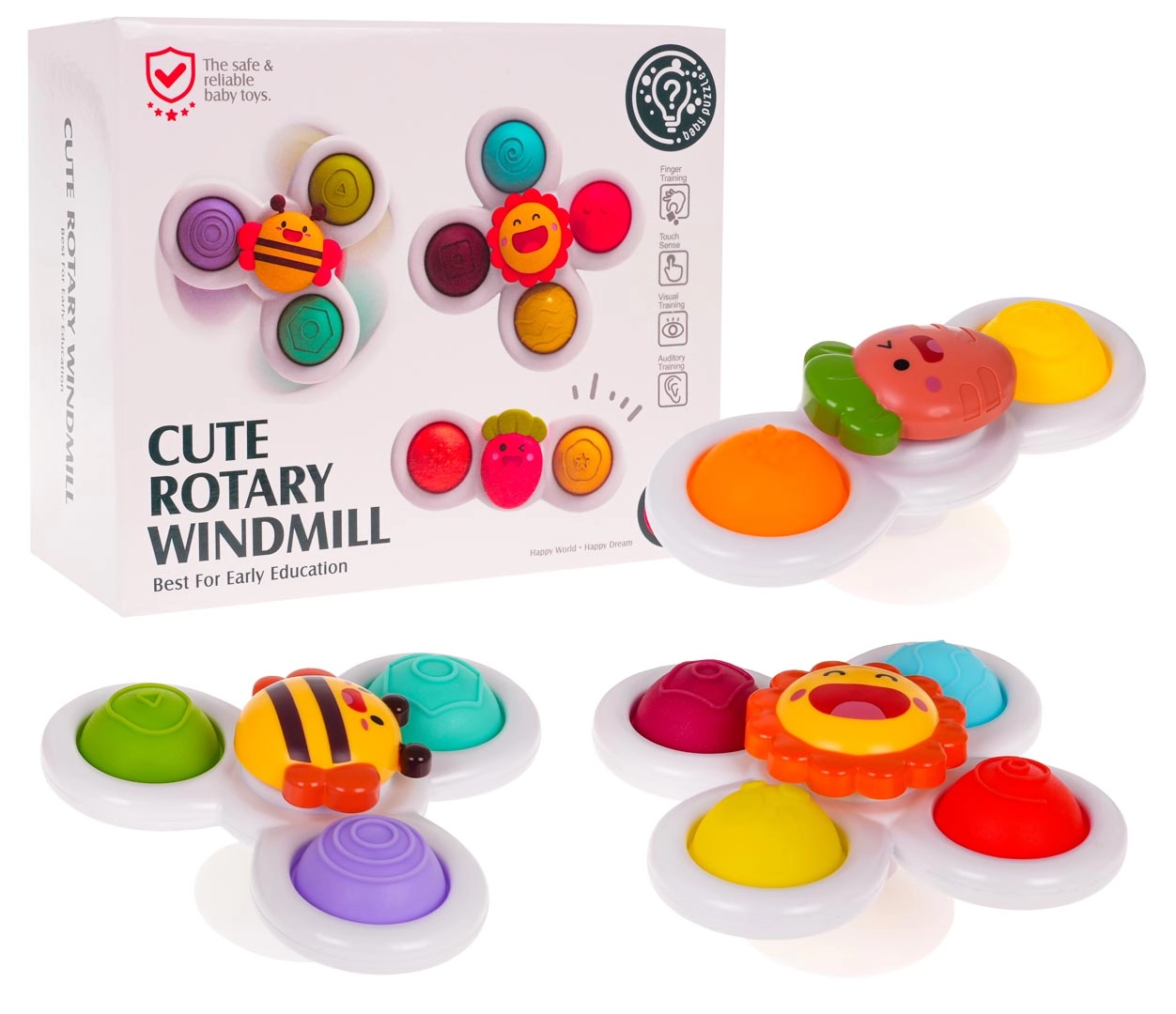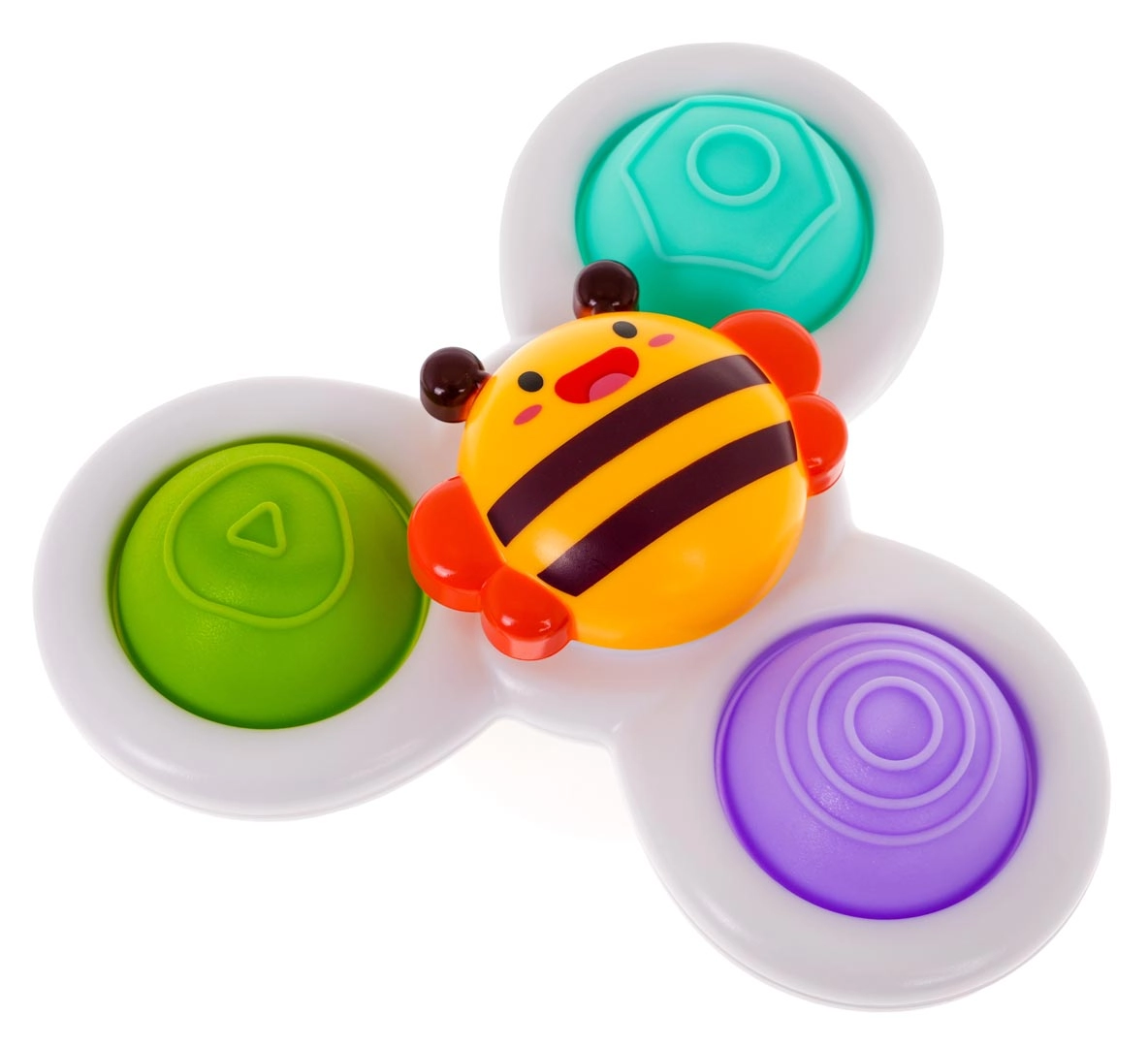 Tre simpatici motivi – sole, ape e carota – uniscono un design giocoso a funzioni pratiche per lo sviluppo del bambino. La potente ventosa sul retro permette di fissare il gioco su varie superfici lisce, mentre i cuscinetti resistenti assicurano una rotazione lunga e fluida. Grazie al design impermeabile, gli spinner sono perfetti anche per il bagno.