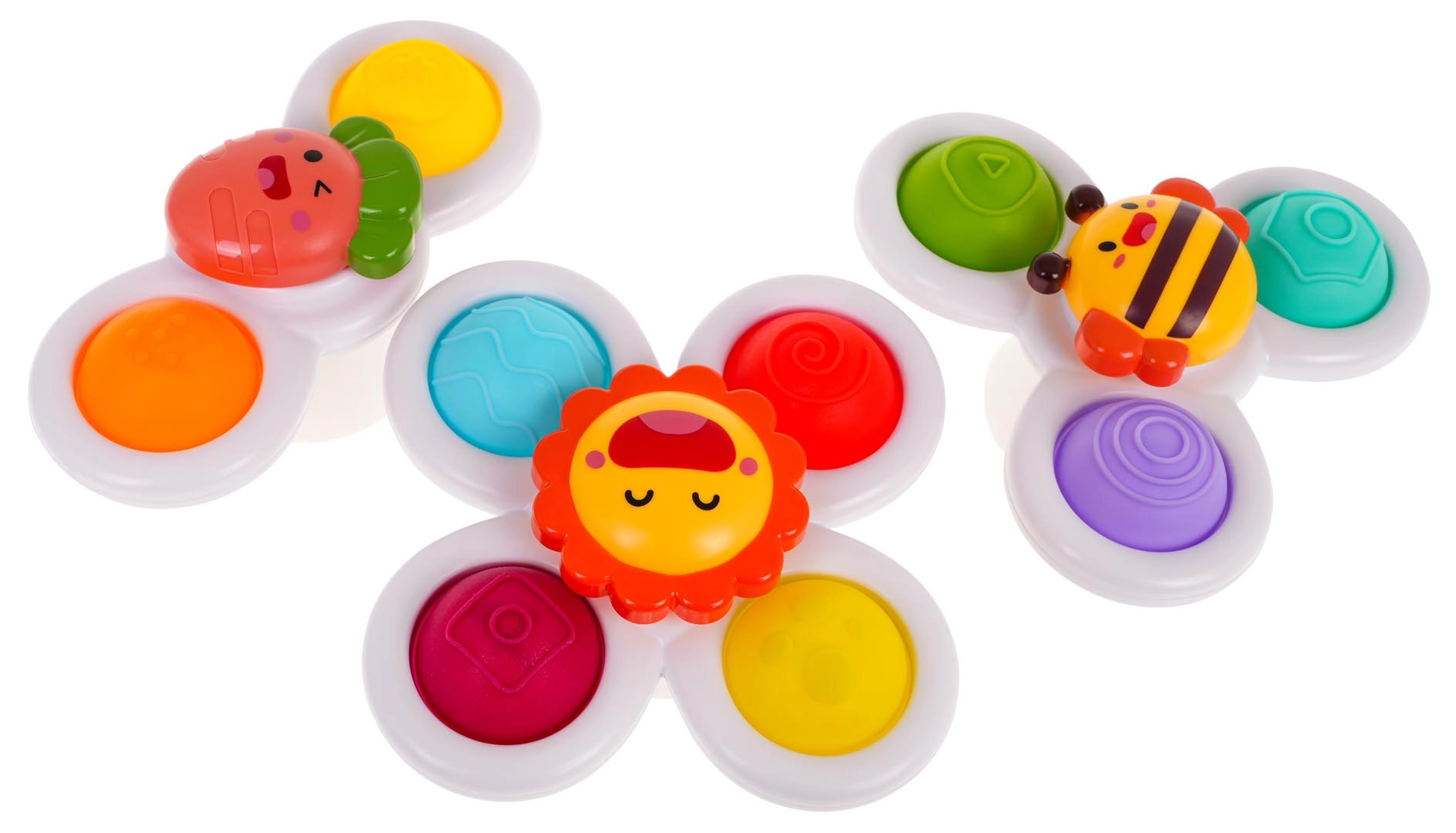 Scopri il divertimento e lo sviluppo della motricità fine con un colorato set di tre spinner sensoriali con una potente ventosa. I giochi ruotano in modo fluido, sono impermeabili, adatti da 18 mesi e hanno pulsanti in gomma da premere che stimolano i sensi e rilassano. Fissali su vetro, vasca o tavolo e regala ai bambini tanto divertimento stimolante a casa e in viaggio.