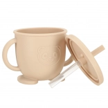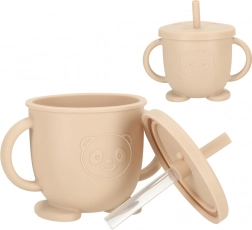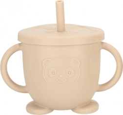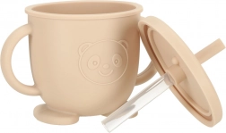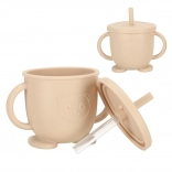 Il bicchiere in silicone con cannuccia e due manici favorisce il bere in autonomia e riduce il rischio di rovesciare.