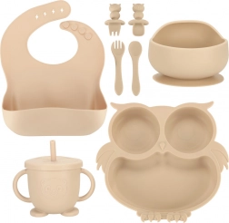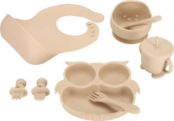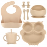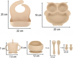 Set completo in silicone per le prime esperienze di autosvezzamento. Include piatto a forma di gufo, ciotola, bicchiere con cannuccia, bavaglino e 2 paia di posate. Realizzato in silicone alimentare sicuro, con ventosa antiscivolo su ciotola e piatto, posate ergonomiche per le manine e bavaglino con tasca per meno disordine.
