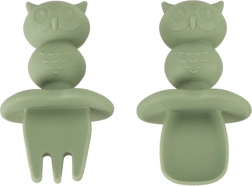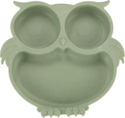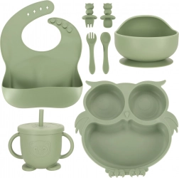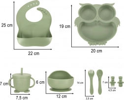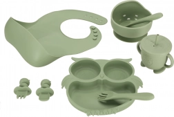 Pratico e attraente set di stoviglie in silicone pensato per i bambini. Include tutto ciò di cui il tuo bambino ha bisogno per un pasto comodo e divertente. Il motivo del gufo in colore verde militare è non solo alla moda, ma farà anche felice ogni piccolo commensale.