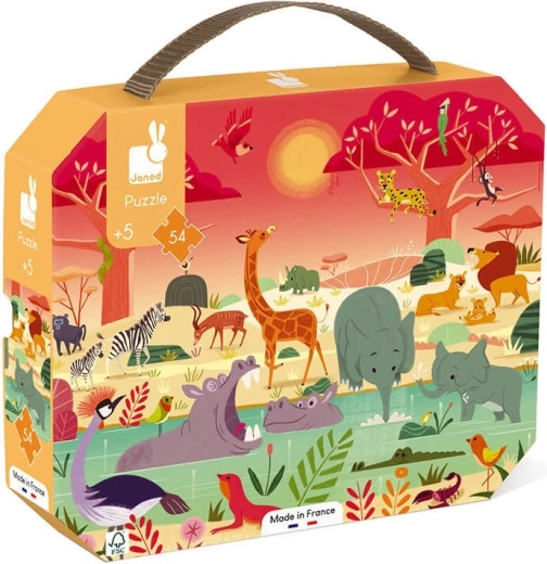 Puzzle JANOD con immagine della savana. Il puzzle è confezionato in una valigetta originale e pratica, adatta sia per casa sia per i viaggi. Il set include un poster come modello.