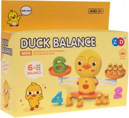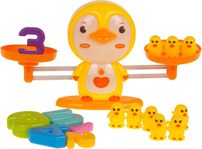 Anatra su base con bilancia a piatti; anatrine di pesatura (2× singola, 2× doppia, 1× tripla); numeri 1–6; carta con esercizi matematici