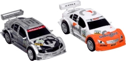Due macchinine con dettagli adesivi e design aerodinamico garantiscono velocità e competizione.