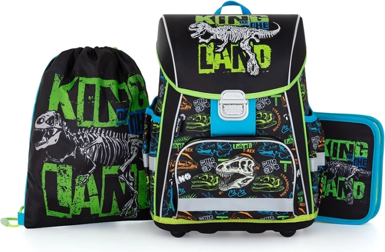 Cartella: La cartella scolastica della linea Premium è anatomica e garantisce il corretto posizionamento sulla schiena. Lo schienale rinforzato e l’irrigidimento interno mantengono la forma stabile dello zaino. L’imbottitura è in materiale piacevole e traspirante, le bretelle larghe e imbottite sono progettate per aderire perfettamente e distribuire uniformemente il peso sulle spalle del bambino. La cartella è composta da un unico ampio scomparto, dove entrano comodamente tutti gli accessori scolastici per i bambini di 1ª e 2ª classe. Il fondo dello zaino è in materiale rigido, proteggendo il contenuto da ribaltamenti e rovesciamenti. La chiusura è con fibbia di sicurezza. La taschina anteriore è destinata alla merenda; non mancano numerosi elementi riflettenti che rendono la cartella più visibile. Capacità: 28 l. Portata: 8 kg. Sacca: Sacca scolastica per ginnastica realizzata in materiale di qualità. La sacca si chiude tirando i cordini. Adatta sia per la scuola sia per lo sport e altre attività del tempo libero dei bambini. Astuccio: Astuccio scolastico a un piano con due alette, senza contenuto. Passanti elastici per fissare gli articoli da scrittura. Sull’aletta interna è presente una pellicola trasparente per l’orario delle lezioni.