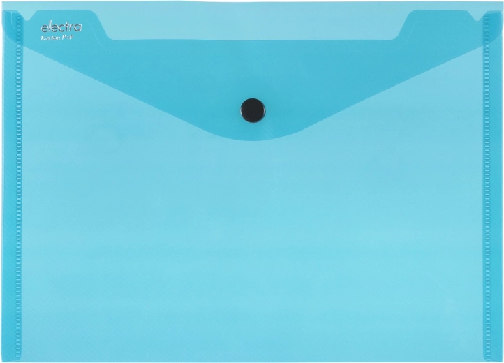 L'elegante clutch A5 Electra è realizzato in polipropilene con uno spessore di 220 mic, garantendo la sua resistenza e qualità. La chiusura facile con bottone a pressione assicura un trasporto sicuro dei documenti: