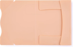 Cartella con tre lembi in polipropilene di colore pastello albicocca, offre una chiusura con elastico e un dorso espandibile per una capacità fino a 250 fogli formato A4.