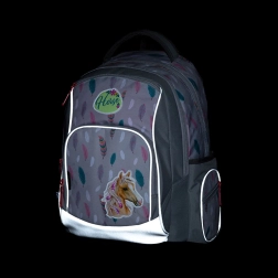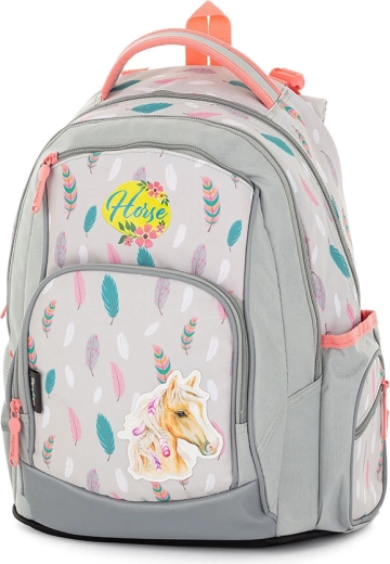 Zaino scolastico Oxy Go leggero ed ergonomico con motivo del cavallo, ideale per bambini a partire da 125 cm di altezza (1ª–3ª classe). Offre schienale anatomico e traspirante, spallacci regolabili per un trasporto confortevole, ampio numero di tasche e scomparti per libri e piccoli oggetti e fondo rigido contro lo sporco e le perdite. Per una maggiore sicurezza non mancano elementi riflettenti.