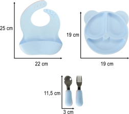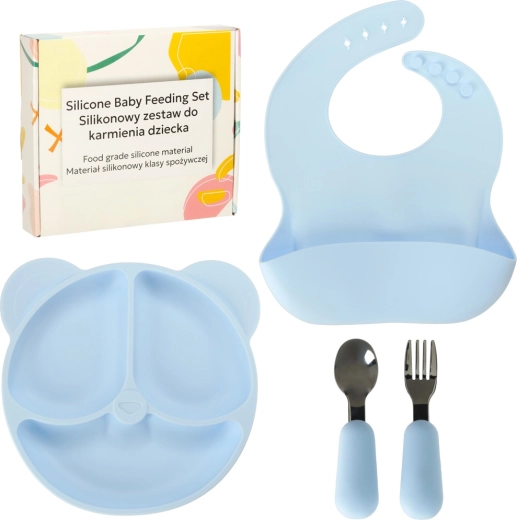 Pratico set da tavola in silicone a 4 pezzi per bambini, di colore blu, con un tenero motivo a orsetto, per un pasto comodo e sicuro. Include piatto con scomparti, bavaglino con tasca e posate ergonomiche con finitura antiscivolo. Realizzato in silicone per uso alimentare privo di sostanze nocive, si pulisce facilmente e favorisce l’autonomia a tavola.