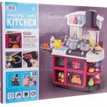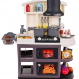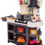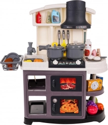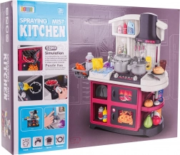 Questa cucina in plastica è ben realizzata e dotata di tutto ciò che serve ai bambini per giocare a cucinare. Ruotando le manopole si sentono suoni realistici di cottura e frittura e i fornelli si illuminano. Aggiungendo qualche goccia d’acqua si genera un delicato vapore freddo che intensifica l’impressione della vera cottura. Il rubinetto scorre davvero, così i bambini possono “lavare” i piatti nel lavello.