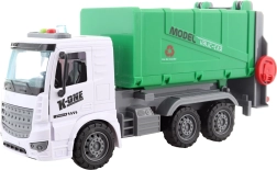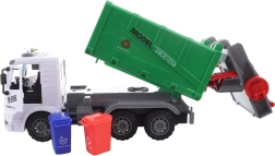 Camion della spazzatura in plastica a batteria. Tramite due pulsanti posizionati sulla cabina emette suoni di marcia e retromarcia. Include 2 bidoni; con l’apposita manopola è possibile svuotarli. Batterie 3x AG13 incluse nella confezione. La parte posteriore del contenitore dei rifiuti può essere aperta manualmente. Confezionato in scatola. Dimensioni confezione ca. 32×11,5×18,5 cm. Dimensioni del veicolo ca. 28×14×8,5 cm. Età 3+.