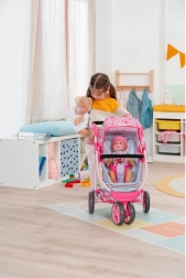 La ricca dotazione, inclusi biberon, ciuccio, pannolino, piattino, cucchiaino e altri accessori, stimola la fantasia, il cambio d’abito e le scenette di vita quotidiana.
