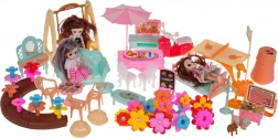 Inclusi arredi completi, altalena da giardino, ombrellone, animaletti e scooter. Le tre bambole hanno arti mobili e lunghi capelli ideali da pettinare.